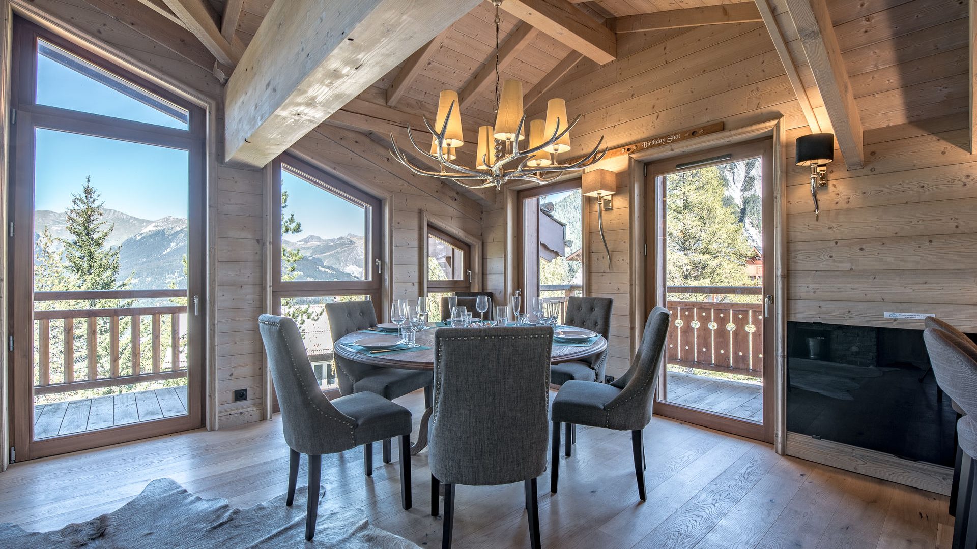 Step into this property through an elegant entrance that sets the tone for your mountain retreat. The spacious living room, bathed in natural light, is separated from the dining area by a grand fireplace, providing a cosy and inviting atmosphere welcoming you to unwind after an exciting day’s skiing on Courchevel’s slopes. The round dining table, with seating for five, offers captivating views of the surrounding mountain range through expansive balcony doors.
