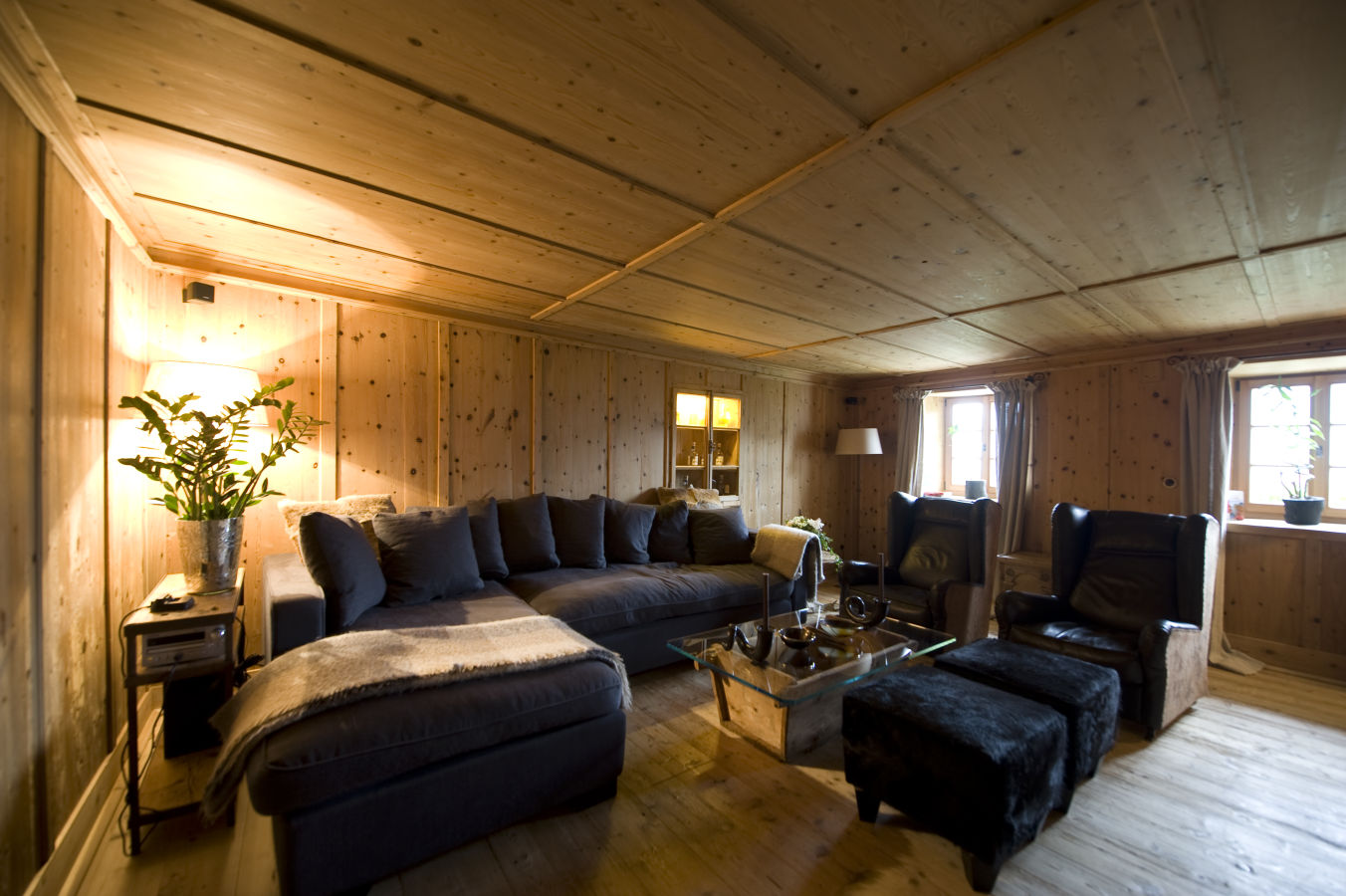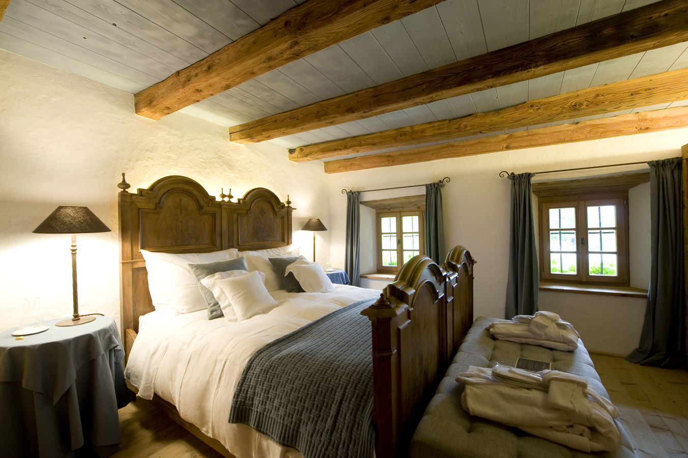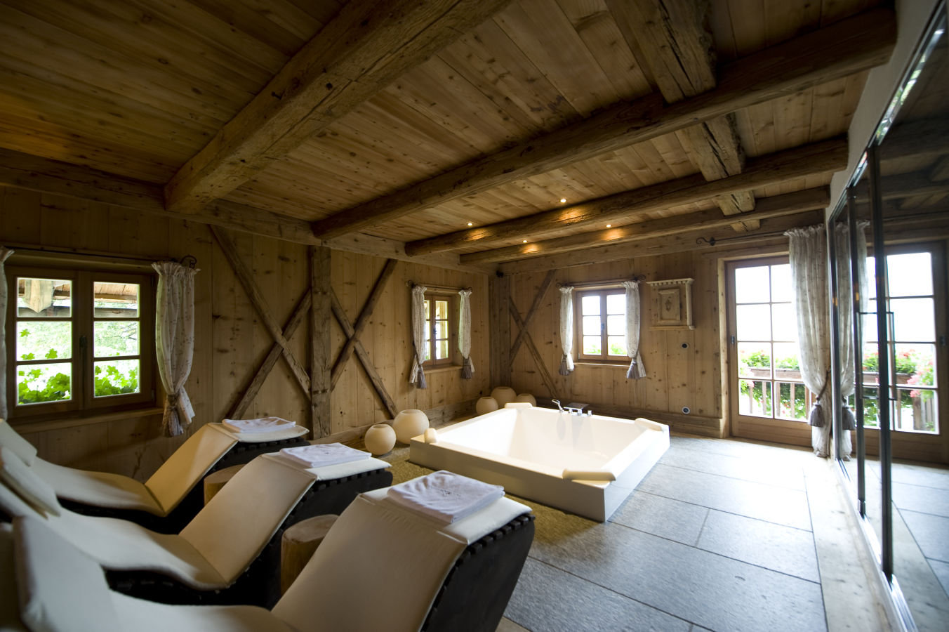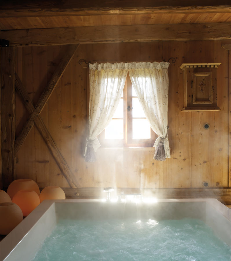 The lodge sleeps 10 people in four bedrooms – each different from the others and unique in its own way. Some have valley views while others face the woods, but they all share some common qualities: they are bright, quiet, romantic, and designed with loving attention to every detail. Luxury, however, has certainly not been overlooked. The finest linen sheets, goose down duvets, cashmere throws and fine furnishings are found throughout and the lodge features a sauna, hammam, and fabulous outdoor whirlpool with jaw-dropping panoramic views across the valley.